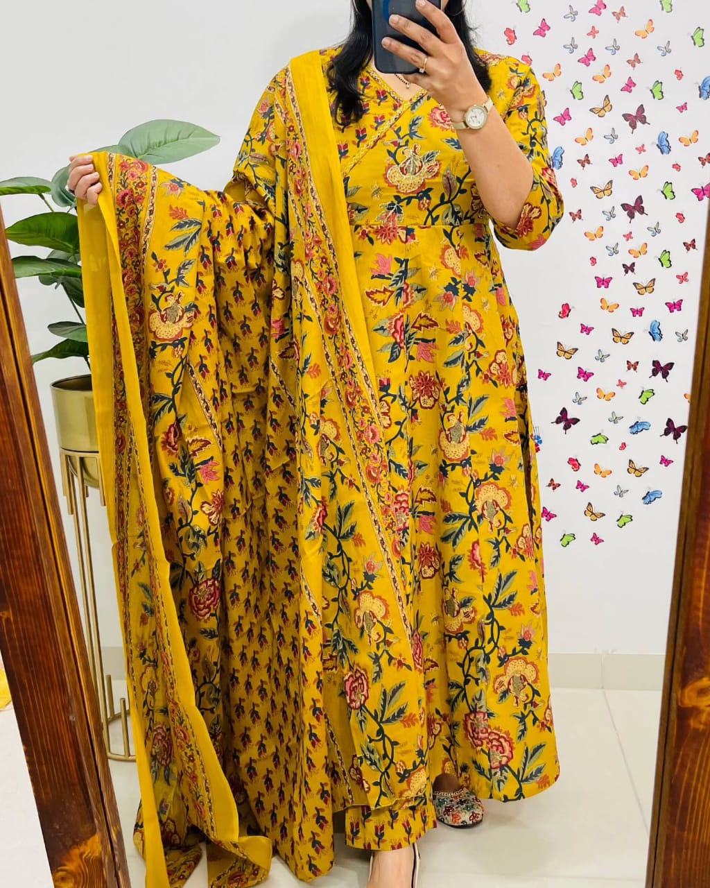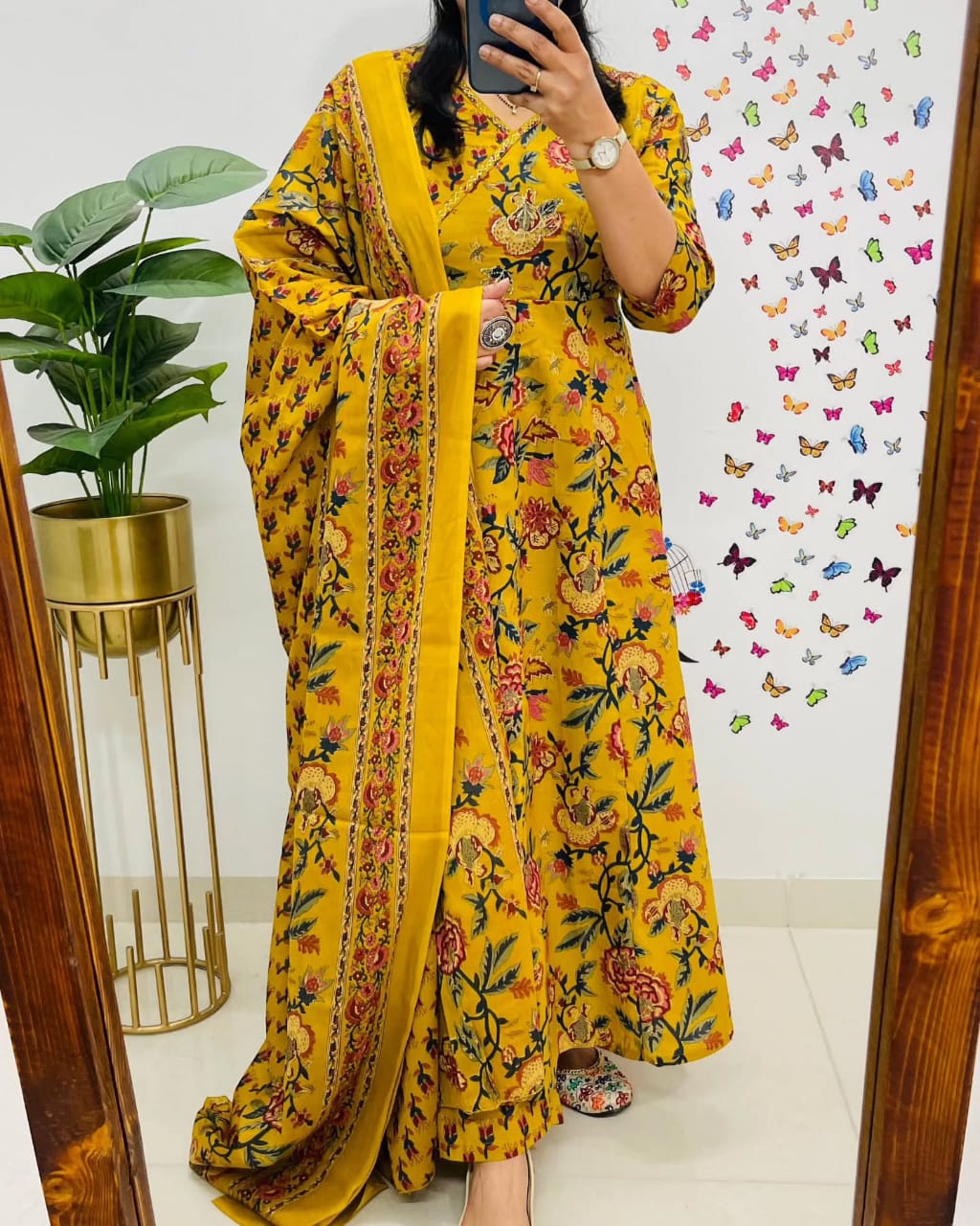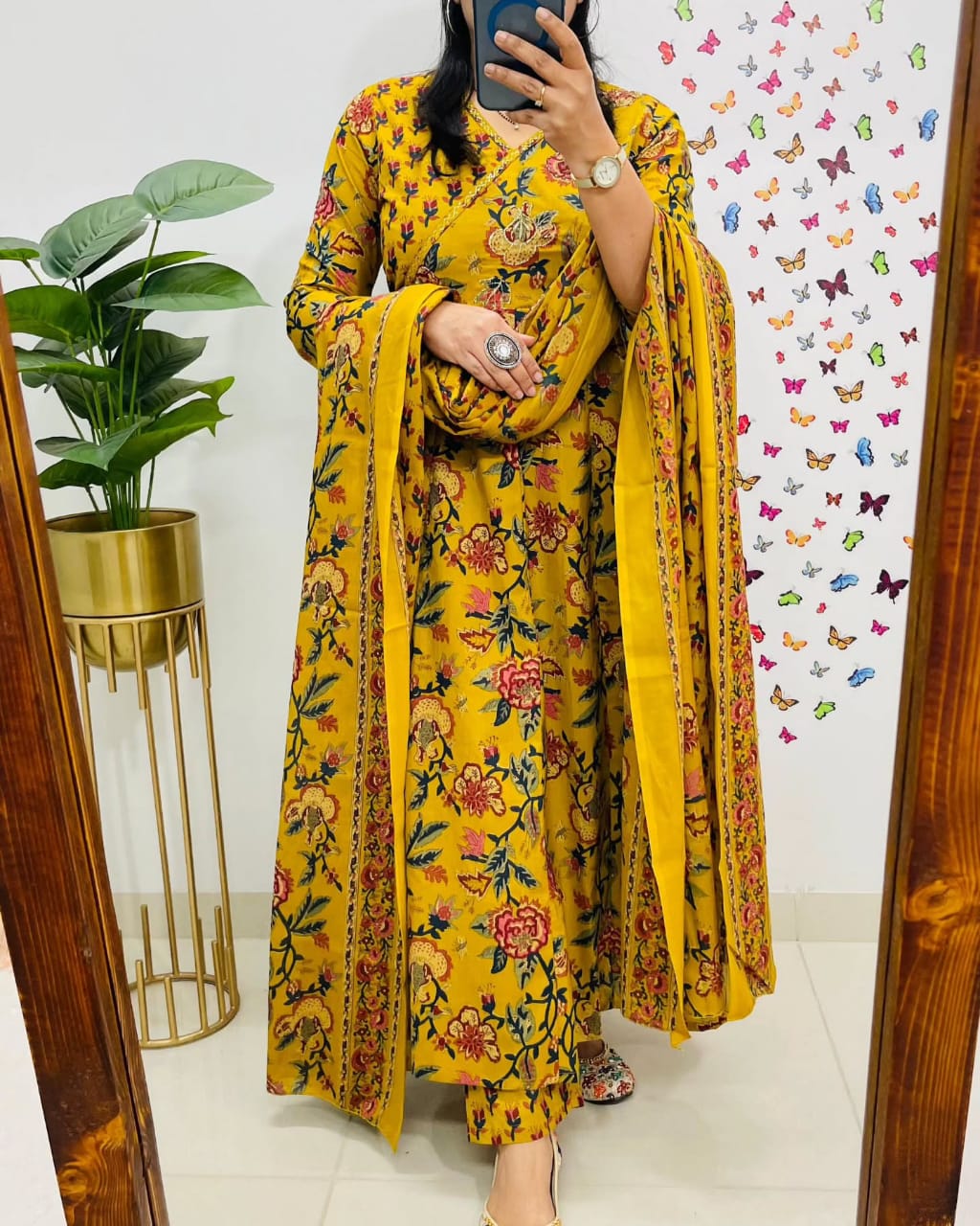 Elevate your casual wardrobe with this stunning ethnic set that exudes effortless charm. The ensemble features a beautifully crafted kurta, straight pant, and dupatta, perfect for women who appreciate traditional aesthetics with a modern twist. The kurta boasts a captivating floral print, adding a touch of femininity and elegance to the overall design. Crafted from 100% viscose, this set ensures comfort and breathability, making it ideal for all-day wear. The yellow hue of the outfit is sure to brighten up any occasion, while the keyhole neckline adds a subtle yet stylish detail.