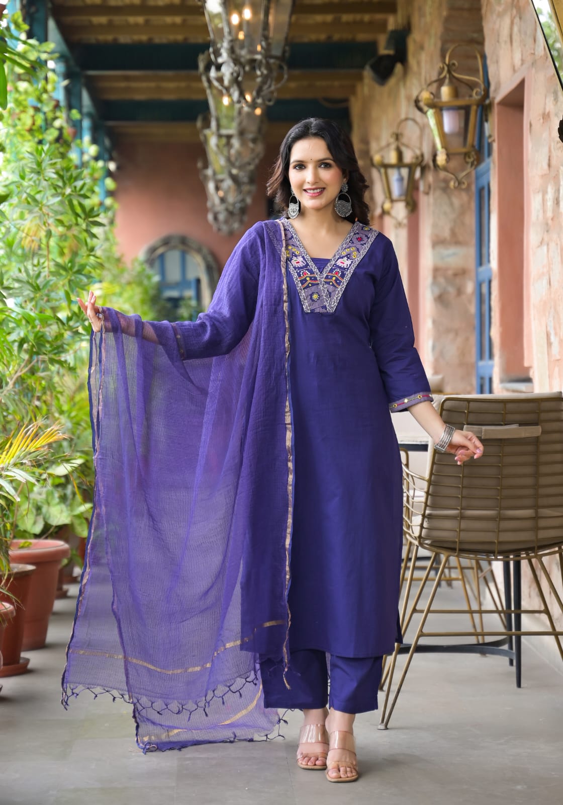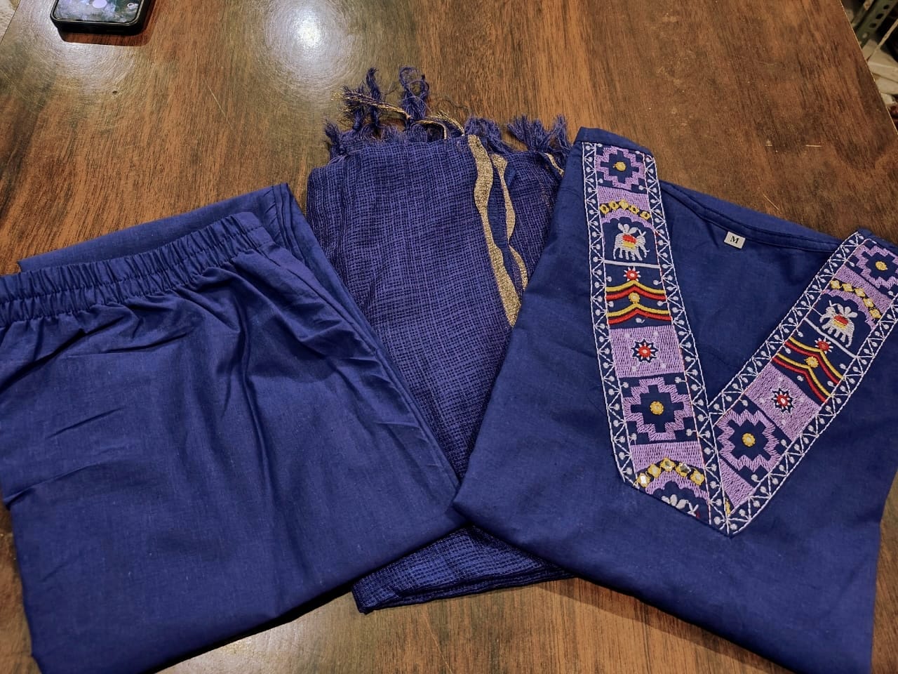 Blue Cotton Kurta Pant and Dupatta Set with Neck Work