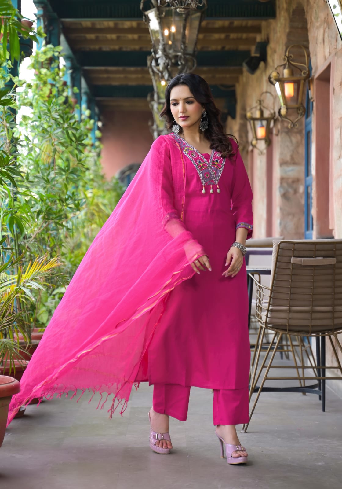Pink Cotton Kurta Pant and Dupatta Set with Neck Work