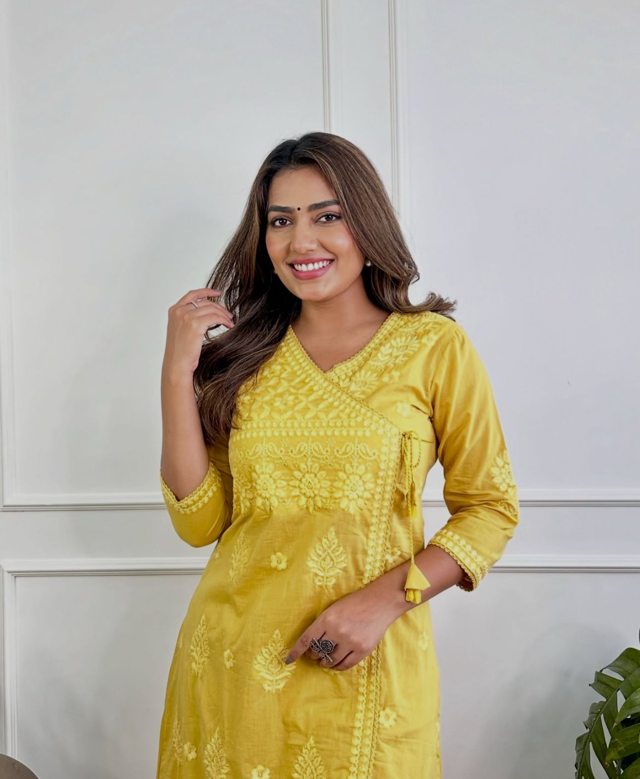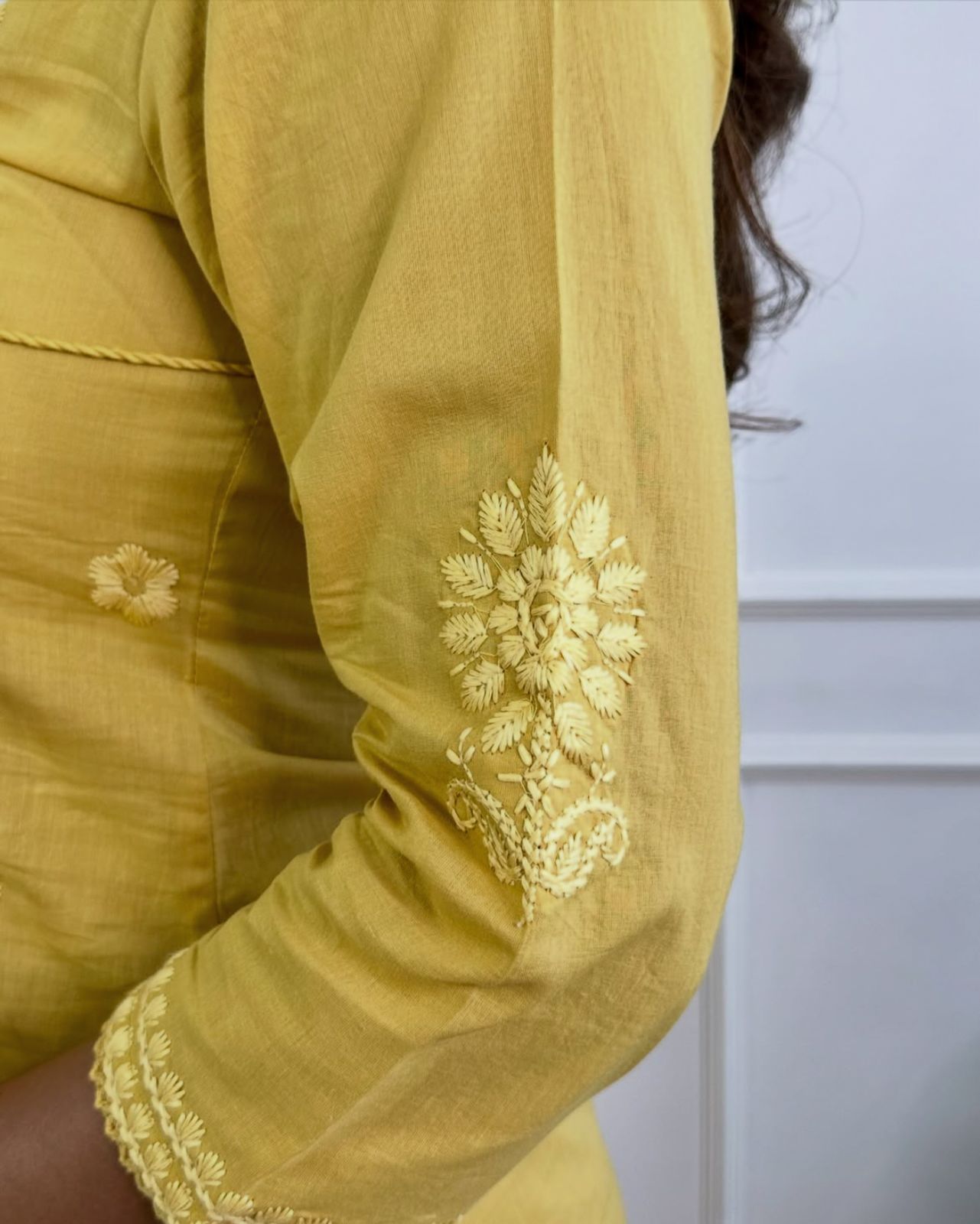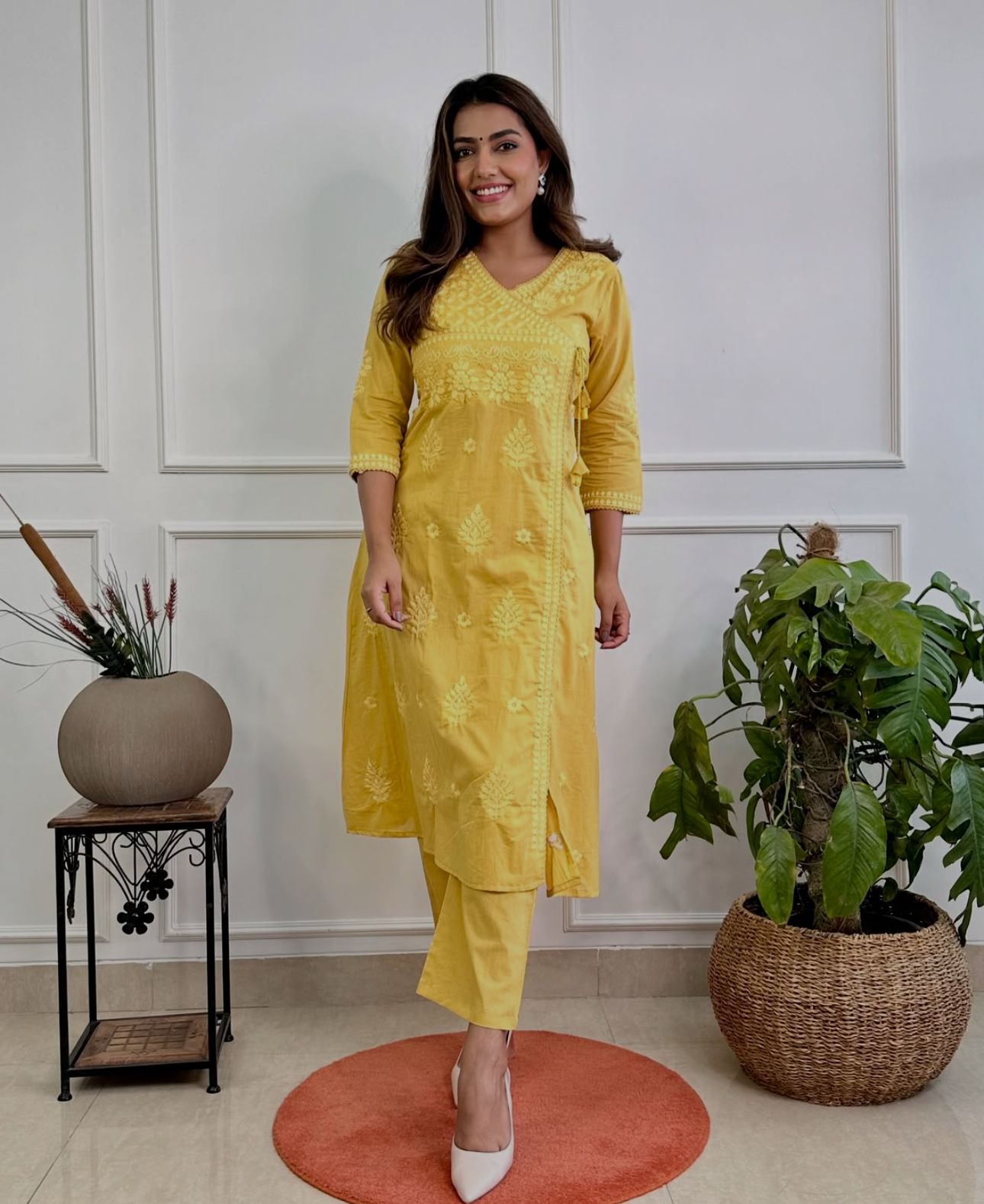 Yellow Cotton Chikankari Angrakha Style Kurta and Pant Set